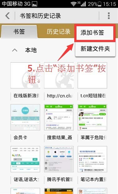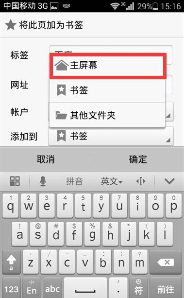 在“历史记录”里,对需要做主页的网页点后方的“☆”将会弹出步骤6的界面,只是标签、网址都已经自动填好了,只用修改添加到后面的“书签”为“主屏幕”(同步骤7)。