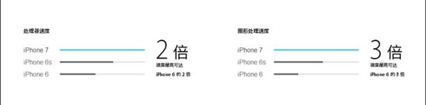 全新的A10 Fusion芯片中高性能核心的运行速度最高可达iPhone 6的2倍,图形处理器的速度最高可达iPhone 6的3倍,而高能效核心在运行时的功率则可低至高性能核心的五分之一。