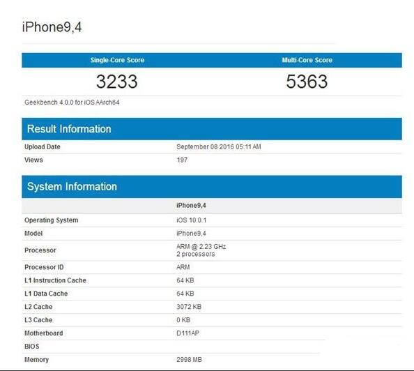 好在苹果旗舰iPhone7 Plus终于用上了3G内存,除此之外系统使用iOS 10.0.1系统,主频达到2.23GHz,主板型号是D111AP。