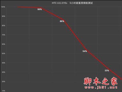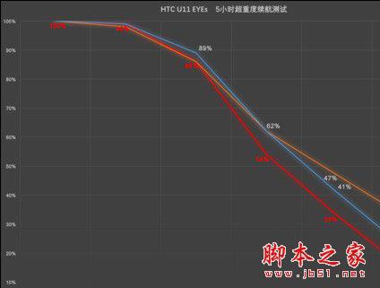 实际测试结果证明了这个猜想是完全正确的,经过我们用于模拟一整天高强度使用场景的5小时超重度续航测试,HTC U11 EYEs剩余电量仅14%,堪称市面上新机的垫底水平,别说对比电池容量相近的其他机型,就连3000mAh电池的小米6都能轻松虐它。看来,能在续航上做到更差的也就只有搭载2300mAh小电池、双屏幕和骁龙835,并且运行“毒瘤”Samsung Experience系统的三星W2018了。