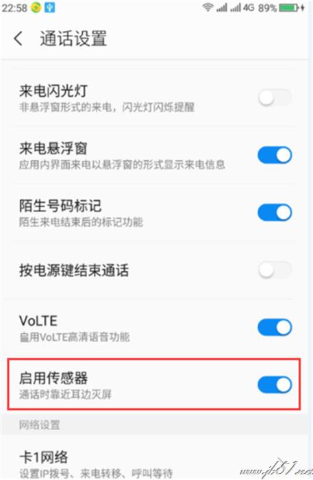 进入通话设置之后,找到【启用传感器】选项,后面有个按钮把此功能打开即可。