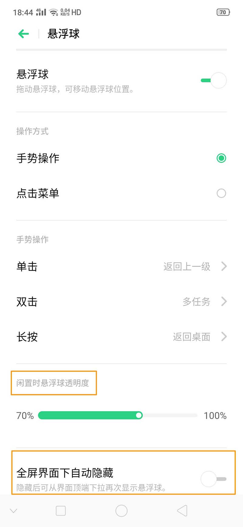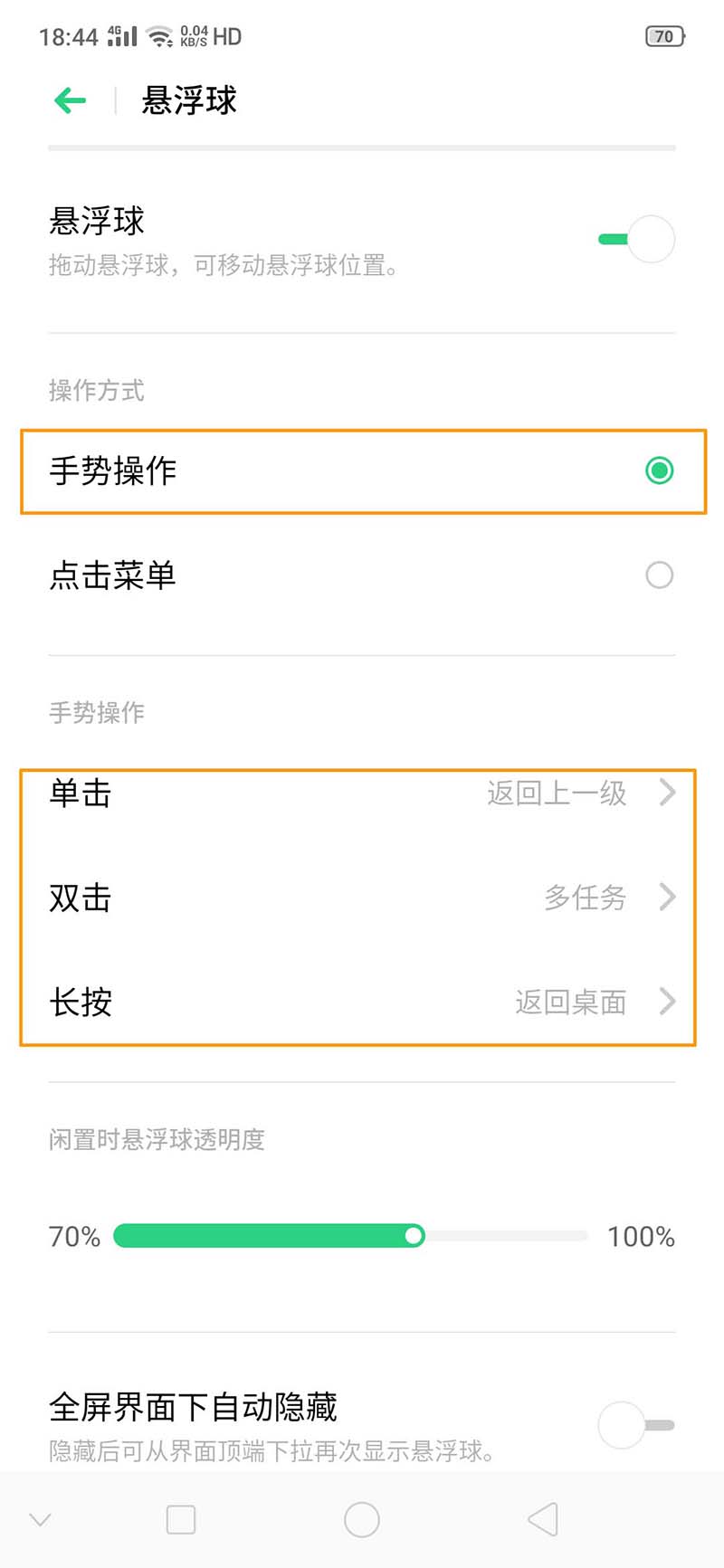 3、而且,相同路径下可设置【闲置时悬浮球透明度】和【全屏界面下自动隐藏】。