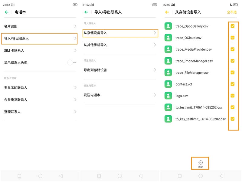 在电话本中找到【导入/导出联系人】选项,点击【从存储设备导入】按钮,我们会看到有不同的导入方式,全部文件右侧打【√】按确定即可导入联系人啦。