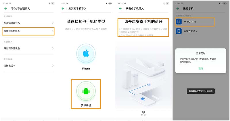 在电话本界面中找到导入导出联系人选项,点击【从其他手机导入】会出现请选择其他手机类型(通过蓝牙,将其他手机的联系人导入本机)按提示操作即可。以安卓手机为例: