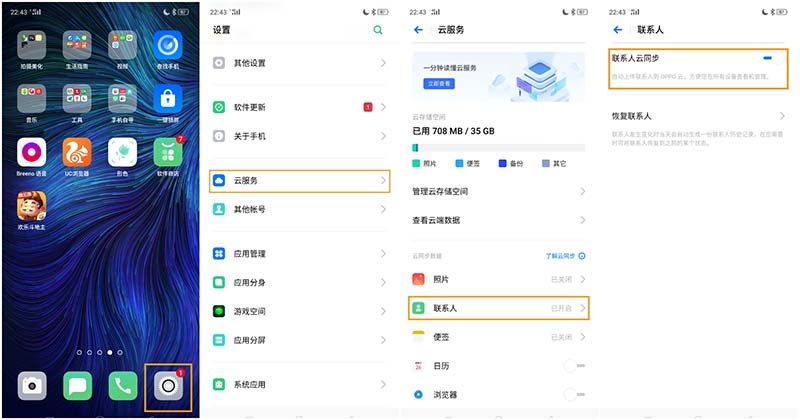 如果你之前曾将联系人同步OPPO云服务可以在新手机登录原OPPO帐户,开启云服务后便会自动将联系人同步新手机中,也可以同步OPPO帐号内的联系数据。