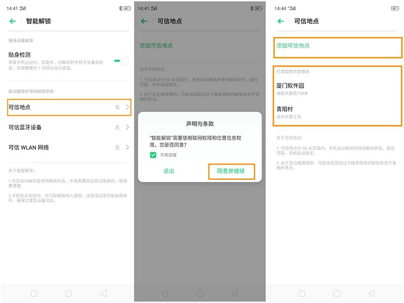 你可以添加办公室、在家里等作为可信地点,在50米范围内,手机将自动解锁并保持解锁状态。路径:进入智能解锁界面【可信地点】—【同意并继续】【添加办公室/家里的地点】即可。如图: