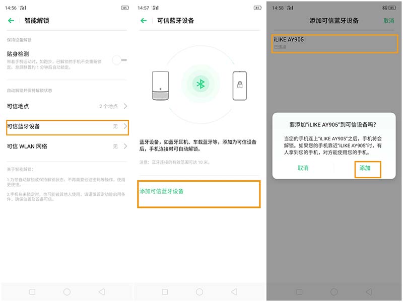 路径:进入智能解锁界面【可信蓝牙设备】~【添加可信蓝牙设备】~【选择蓝牙设备】配对成功后会有已连接的提示呦。如图: