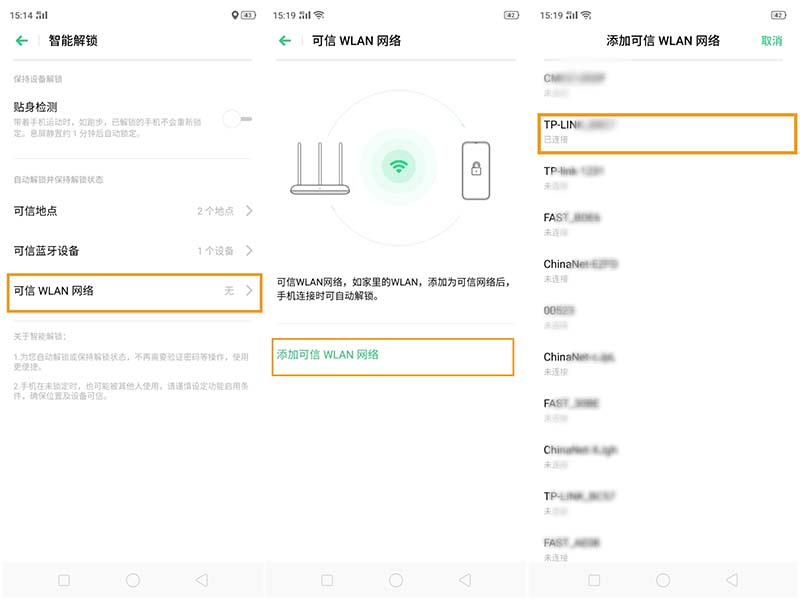 添加家里或者公司WLAN作为可信用网络后,手机连接时可自动解锁。