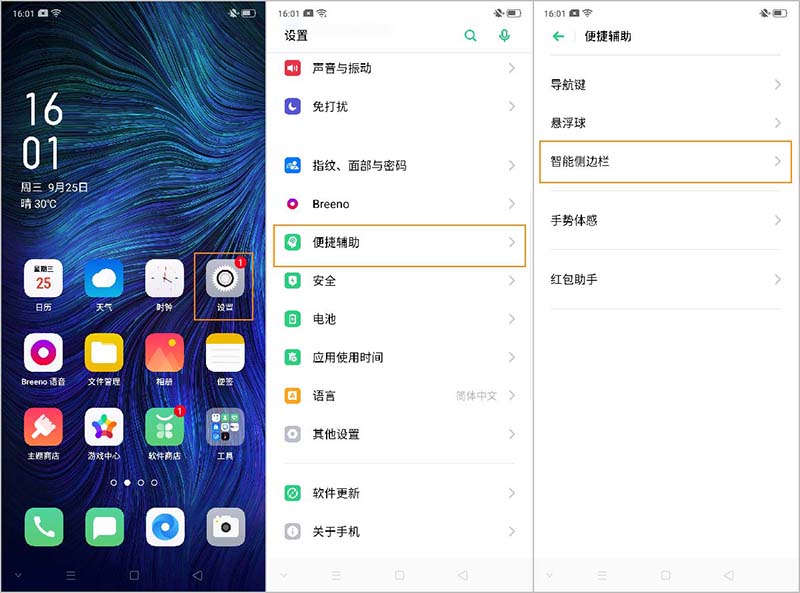 1、通过桌面的【设置】—【便捷辅助】—【智能侧边栏】进入。