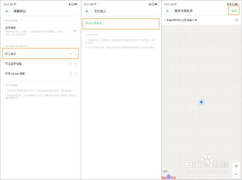 3,智能解锁—可信地点—添加可信地点—点击保存,这样就可以在设定的位置50米范围内手机自动解锁并保持解锁状态,超出范围,手机自动锁定。