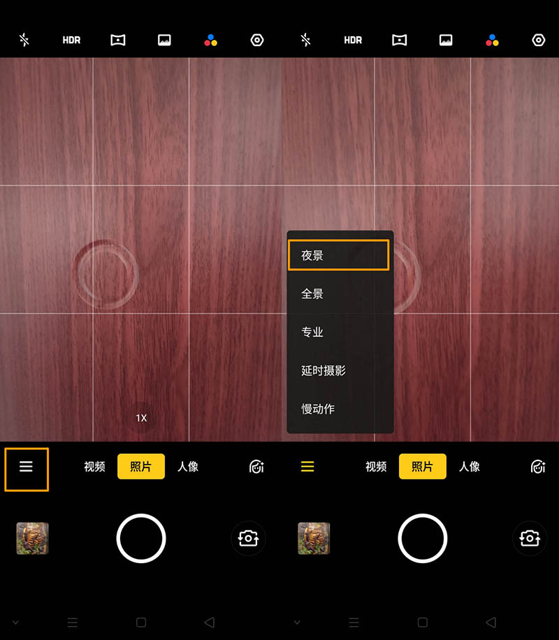 2、点击【视频】左边的三横图标—【夜景】,就可以进行相应的夜景拍照模式。