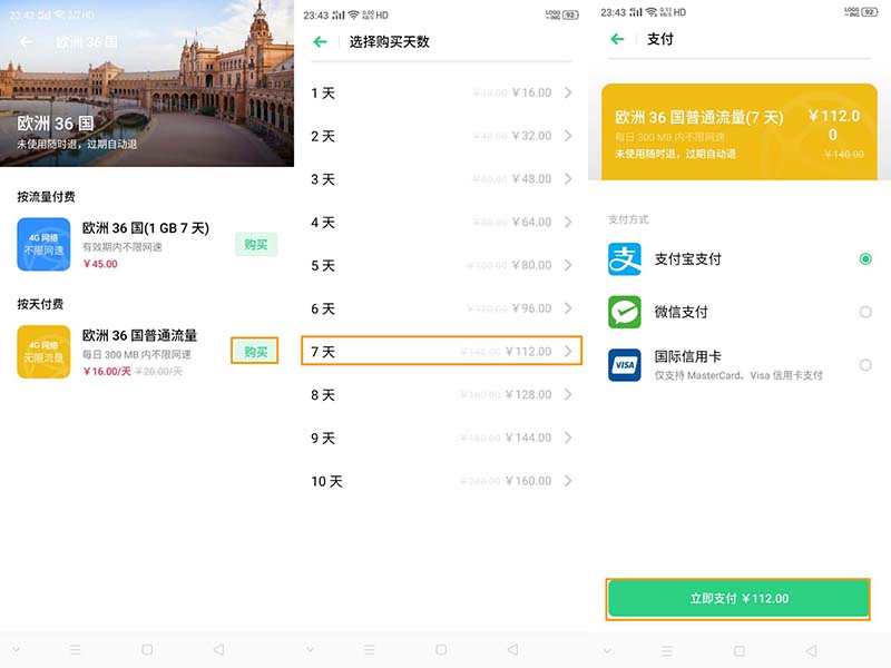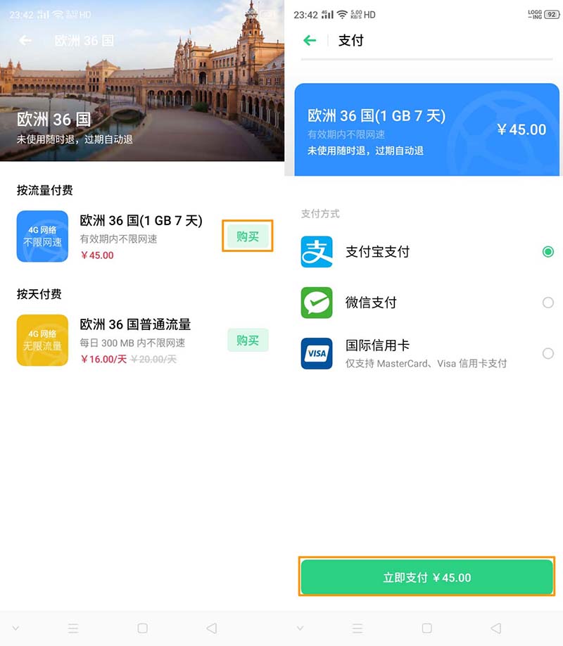 3、如果点击按流量付费,可以选择相应的套餐购买,然后选择相应的支付方式进行支付即可。