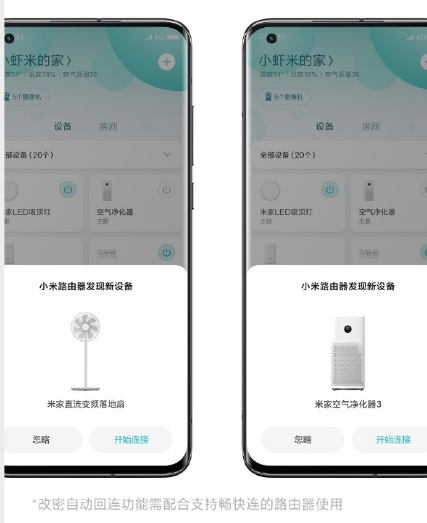 一键连网。手机靠近新设备,就能一键连网;换路由器或改Wi-Fi密码时,同一个小米帐号下设备自动连网。
