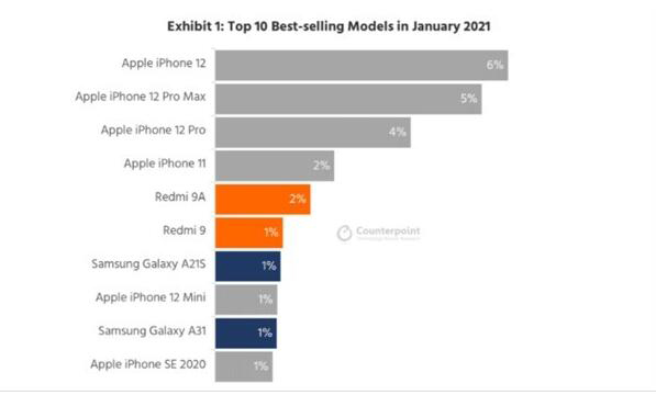 Redmi 9A以及Redmi 9在1月分别获得第五和第六名,其余两款安卓手机分别是三星Galaxy A21S、Galaxy A31也进入该榜单,排名第七和第九。