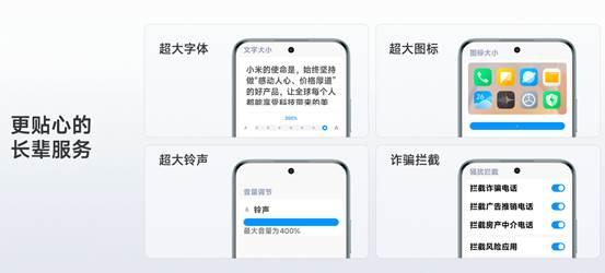 专为老年人群设计「长辈关怀」功能,支持对字体大小(最大可调至 200%)、图标大小(可调大约 10%)、铃声音量(最大可调 400% 大音量)、电话拦截,拦截广告推销电话、拦截房产中介电话、拦截风险应用的调节,一站式调节适老功能,让老人能看得清、听得见、不被骗。