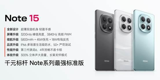 REDMI Note 15 定位千元标杆,Note系列最强标准版。外观采用同档唯一双曲设计,178g重、7.35mm厚,手感轻盈,握持舒适。屏幕升级 6.77" 3200nits超级阳光屏,支持3840Hz 高频PWM + DC调光。续航升级 5800mAh + 45W快充 + 18W有线反充。同时支持IP66多场景生活级防水和湿手触控2.0,通过1.7米花岗岩极限面跌测试、50多项品质测试,获得 CQC 严苛环境卓越品质认证。配备300%立体声大音量和长辈关怀模式,更适合老年群体,是目前千元机中最值的购买的新品。