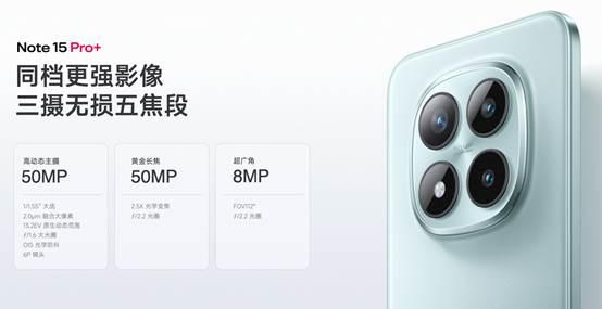 REDMI Note 15 Pro+ 搭载旗舰同款「光影猎人800」主摄,1/1.55" 大底,支持 OIS 防抖,具有超高静态画质、超高视频能力、原生HDR 等能力。支持双原生 ISO Fusion Max,画面动态范围可达 13.2EV,可以说是同级最强主摄。