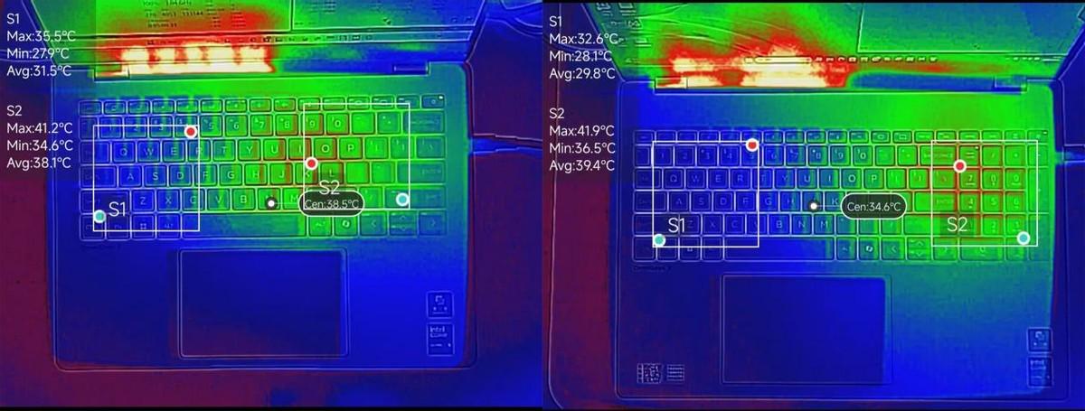 性能模式下的满载C面温度图,左侧是星Book Pro 14,右侧是星Book Pro 16