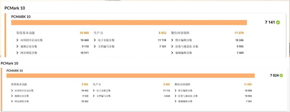 PCMark10的办公性能测试包含了常用基本功能、生产力、数位内容创作。两款机型的分数分别是7024和7141(星Book Pro 14略高一点儿),跑分很高且相近,应对日常应用轻松愉快。