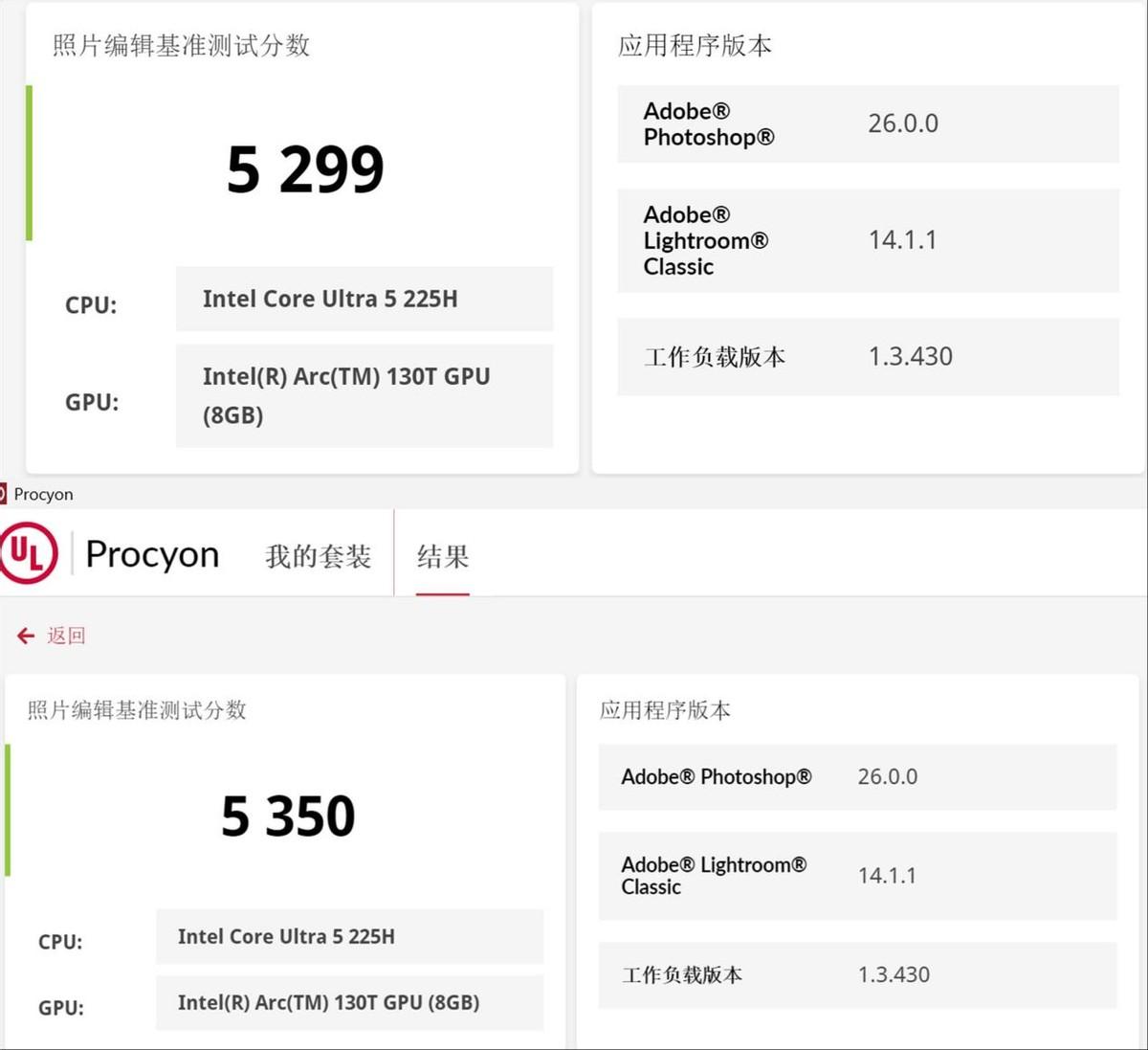 针对PS和LR的照片编辑应用测试中,星Book Pro 14和星Book Pro 16的成绩也几乎没有差别(星Book Pro 16略高一点儿)。