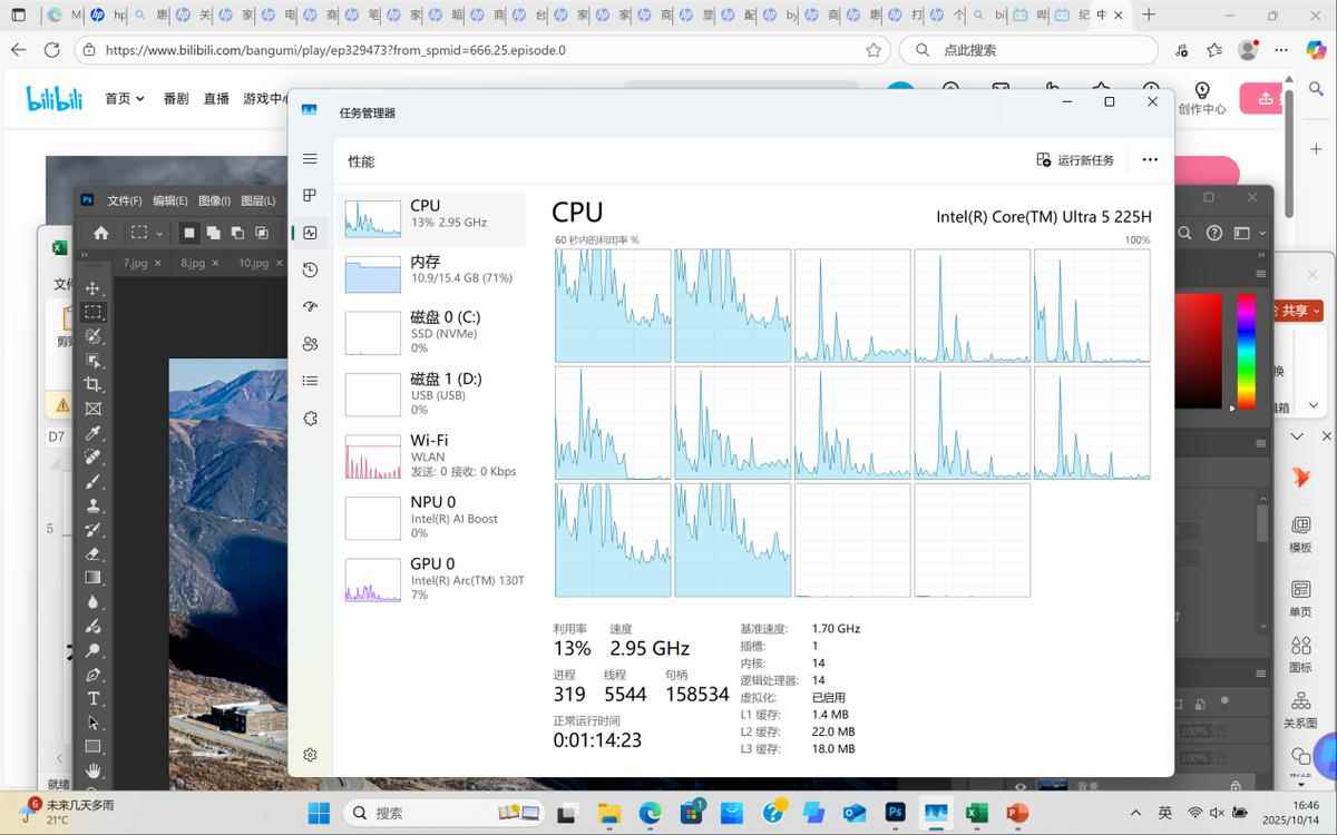 星Book Pro 14/16的CPU性能表现差异极小,所以这里小编就以单一机型,即星Book Pro 14为例来体验分析。在16GB内存下,星Book Pro 14应对日常多开应用表现如何?我们打开20+个浏览器网页,并播放B站视频,打开PS载入15张高分辨率图片,打开超过100MB的Excel文件,此时内存占用在11GB上下,对于一款16GB容量内存的轻薄本,基本上算是重度日常多任务使用场景了。随即我们在PS中进行滤镜处理、在表格中编辑保存、拖动在线视频播放等操作,响应流程无卡顿,同时该机全程保持了安静的使用体验。