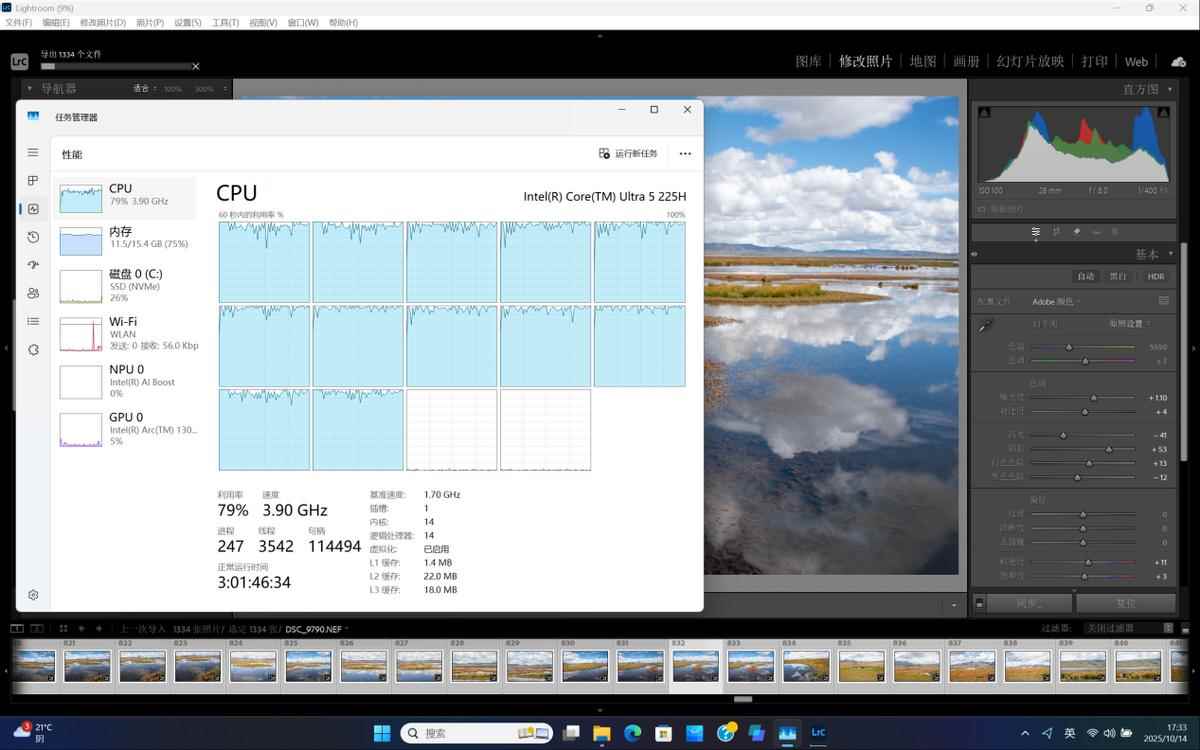 接着小编进行了一个更加重度的应用测试,现在人人都是生活的记录者和人生的摄影师,不管是出去游玩还是工作需求,处理照片都很常见,例如今年的长假期间,小编就拍摄了1300多张2400万像素RAW格式的照片,那么星Book Pro 16批量转换格式并导出1334张照片需要多久呢?实测截图如下所示,总计耗时在12分钟左右,可以看出P核和E核基本满载运行,此时内存占用为11.5GB上下。而在导出照片期间你也可以进行多任务操作,比如在线看视频直播,完全无影响。