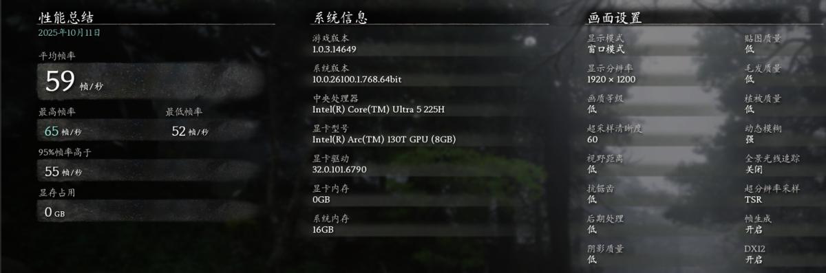 游戏实战测试,为《黑神话:悟空》,画质设置为1920×1200分辨率低画质,开启帧生成加持下,两款机型的平均帧速为60帧上下,已经达到了可玩的级别。