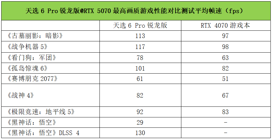从游戏实战测试来看,天选6 Pro锐龙版的表现不错,在2.5K分辨率预设最高画质下,3A大作基本能跑到60fps以上的平均帧速,这可是2.5K分辨率预设最高画质!并且相比RTX 4070游戏本有较明显的帧速提升(除了独显性能以外,天选6 Pro锐龙版毕竟搭载的全新一代CPU,在游戏方面也有优势),由此可见,天选6 Pro锐龙版应对2.5K分辨率下的3A大作游戏高画质运行基本没有问题。而像《黑神话:悟空》这一类新生代的显卡杀手,则可以借助DLSS来实现高画质流畅运行。