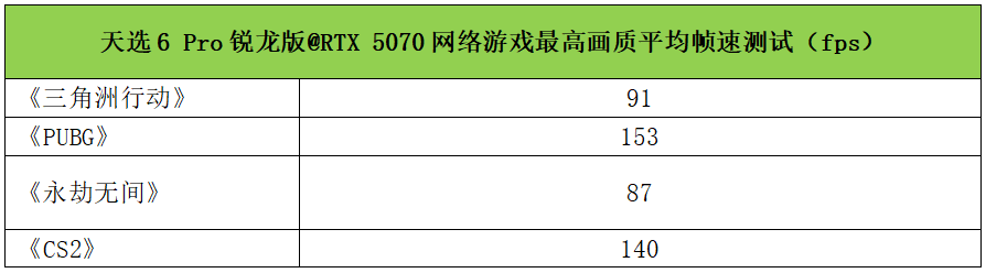 有RTX 5070加持,天选6 Pro锐龙版搞定电竞游戏轻松愉快,《三角洲行动》平均帧数91fps,开启DLSS质量后可到138fps;《PUBG》平均帧速为153fps;《CS2》则是140fps,对于这类游戏实际游戏中玩家都会调低画质,帧速还会进一步提升;《永劫无间》2.5K最高画质下平均帧数87fps,开启DLSS质量后平均帧速为129fps,全部流畅运行,配合DLSS,达到电竞级帧速没有问题。
