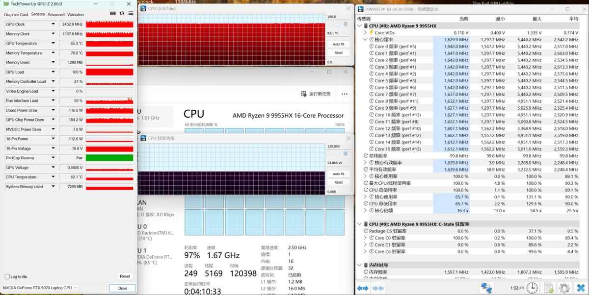 依然是室温25℃左右,增强模式下,对天选6 Pro锐龙版进行双考测试,半小时之后的情况如下所示:锐龙9 9955HX功耗约55W,温度82℃,RTX 5070持续输出功耗约115W,温度85.3℃。增强模式下,整机的性能释放为170W,表现稳健。