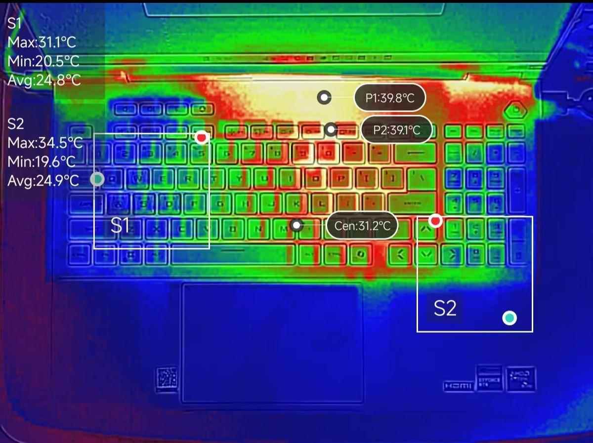 考机分析:在相对较轻机身的前提下,天选6 Pro锐龙版散热表现比较稳妥,高负载下压住锐龙9 9955HX+RTX 5070没什么问题,游戏时完全能保证独显满功率发挥性能,且C面隔热优秀。遗憾是在增强模式下,风扇噪声略大。对噪声比较敏感的小伙伴,可以手动配置功率输出搭配合适的风扇转速,或者在“性能模式”下进行高负载使用,满载用户位噪声大概为44分贝,比一些轻薄本噪声还低一些。