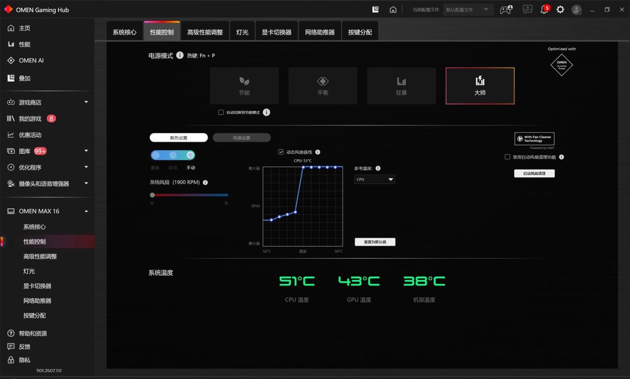 通过实测可见,在3A大作中,大师模式可提供更流畅稳定的性能表现,这种提升源于用户对核心功耗、温度等核心参数的精准调校,硬核玩家可通过精准调校风扇、功耗参数,在不同环境和场景下榨取硬件潜力;追求平衡体验的用户则能在性能、噪音与续航间找到专属平衡点。