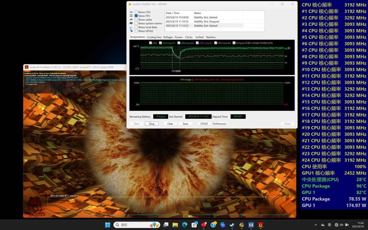 先来用最为直观的双烤测试来看下我们调整的大师模式下的表现。双烤测试使用AIDA 64 Stress FPU+Furmark 1920*1080 8xMSAA进行,时间30分钟。CPU功耗75W左右,全核心频率也都在3.1~3.2GHz左右,温度96度;GPU功耗175W左右,频率2450MHz左右,温度82度。