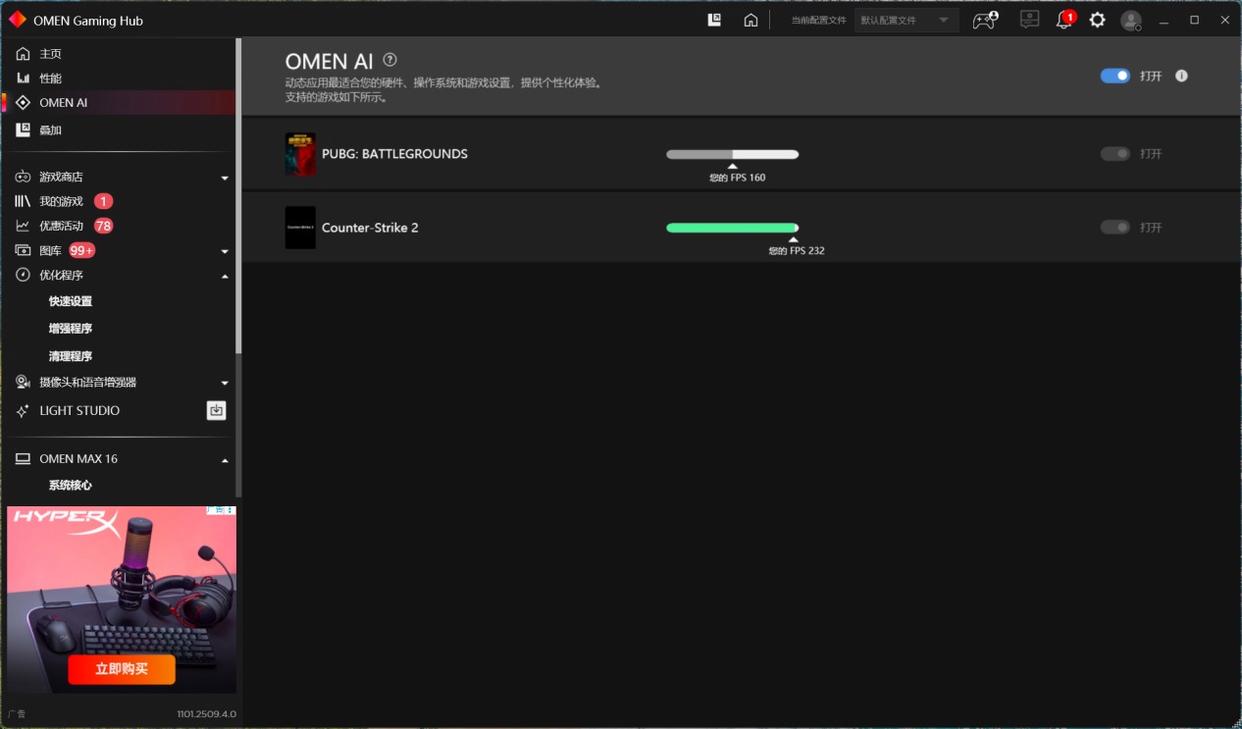 OMEN AI是本代OMEN暗影精灵推出的全新功能,可快速将支持的游戏中的画质调整到最低,直接将游戏帧数最大化。