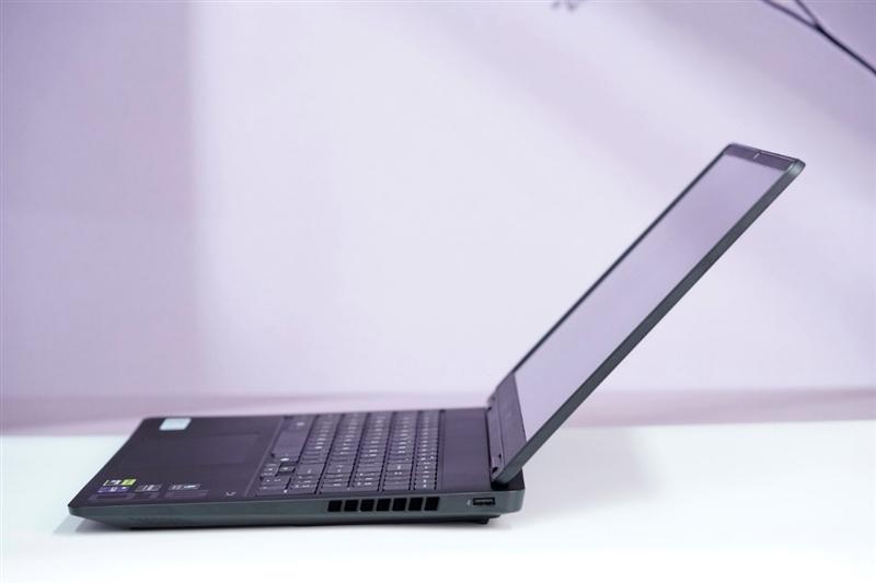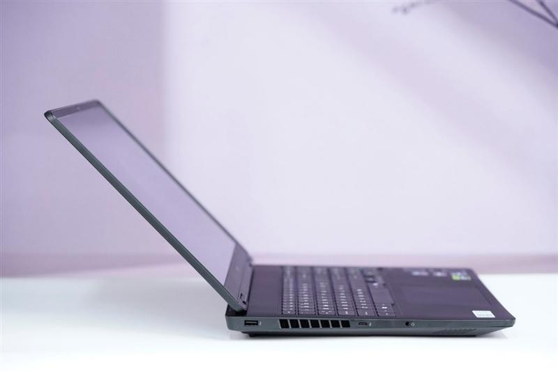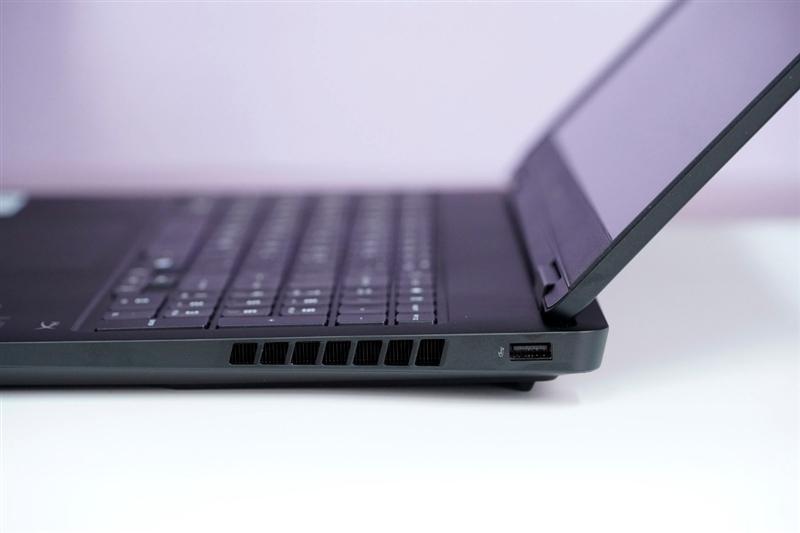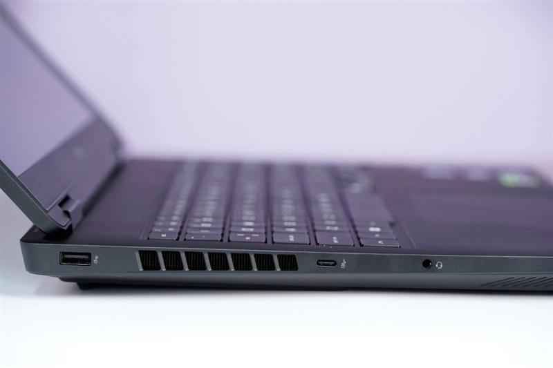 暗影精灵11笔记本左侧除了散热出风口之外,还提供了一个5Gbps的全尺寸USB-A接口,一个10Gbps的多功能USB-C接口,支持100W PD充电和DP 1.4视频输出,和一个3.5mm复合音频接口。