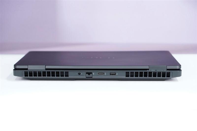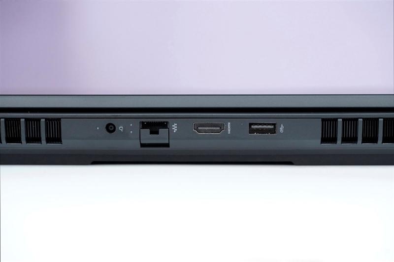 暗影精灵11笔记本后方两个散热出风口之间,从左到右依次是电源接口,可折叠千兆有线网卡接口,HDMI 2.1接口和10Gbps的USB-A接口。