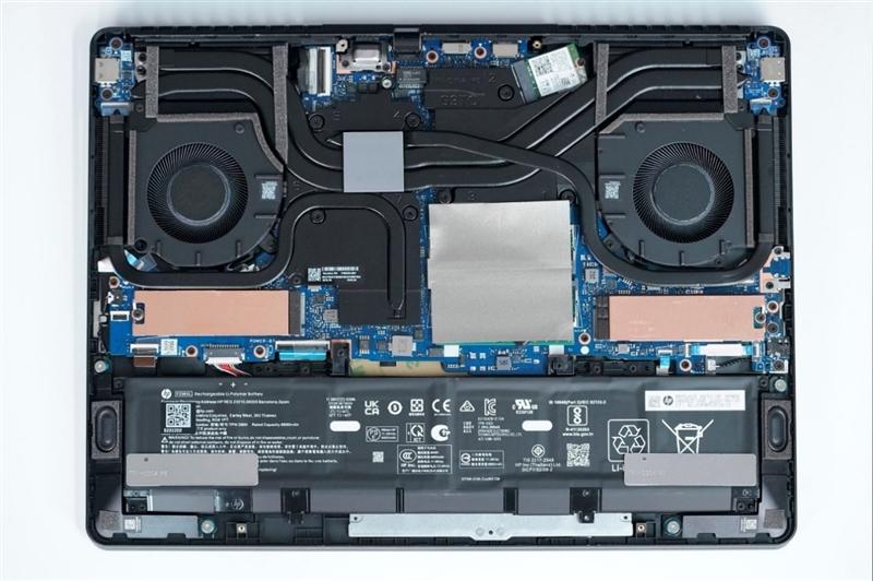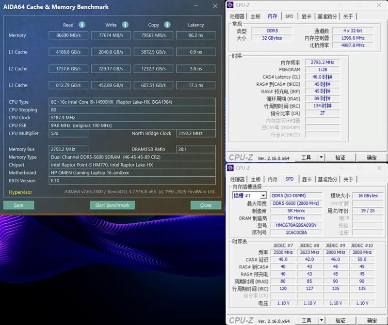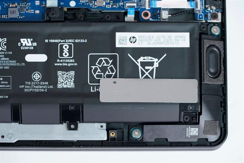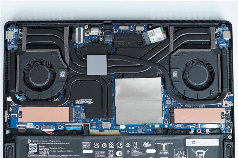 暗影精灵11笔记本正中间的石墨烯导热贴纸下方,是两个内存插槽,已经安装了两条来自SK海力士的16GB DDR5-5600内存,一共32GB容量。
