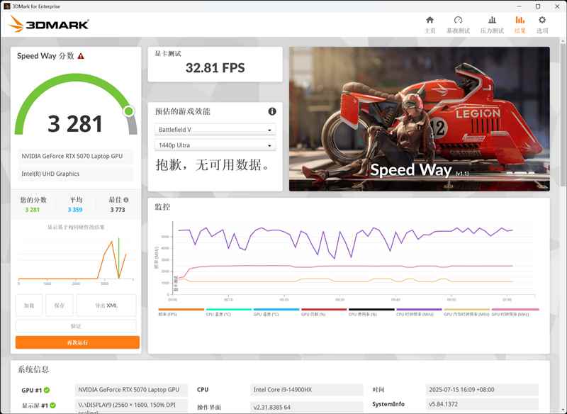 在3DMark测试综合性能的Speed Way测试中,总成绩为3281,其中显卡测试成绩为32.81FPS。