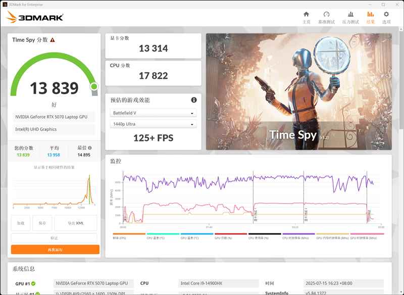 在3DMark的Time Spy(DX12+2K渲染分辨率)测试中,总成绩为13839,其中显卡分数为13314。