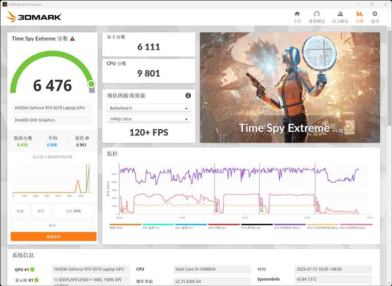 在3DMark的Time Spy Extreme(DX12+4K渲染分辨率)测试中,总成绩为6476,其中显卡分数为6111。