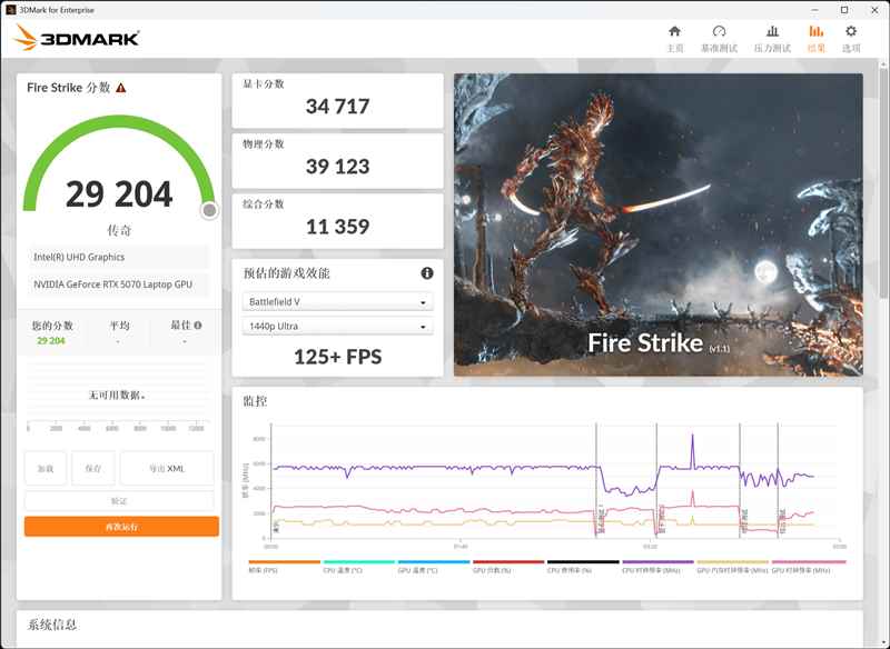 在3DMark的Fire Strike(DX11+1080P渲染分辨率)测试中,总成绩为29204,其中显卡分数为34717。