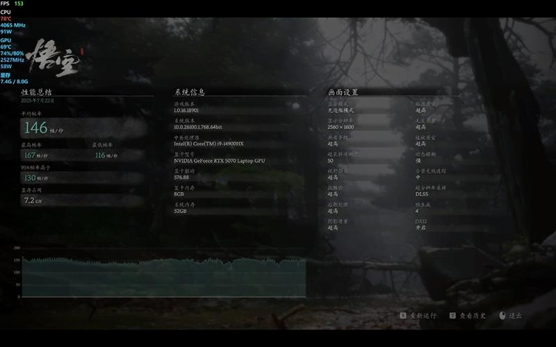 在《黑神话·悟空》中,使用超高画质预设,全景光追设置为中等,DLSS采样精度设置为50,记录2K分辨率时的游戏帧数。
