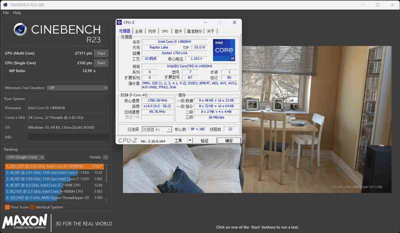 在CINEBENCH R23测试中,单线程成绩为2102 pts,多线程成绩为27311 pts。