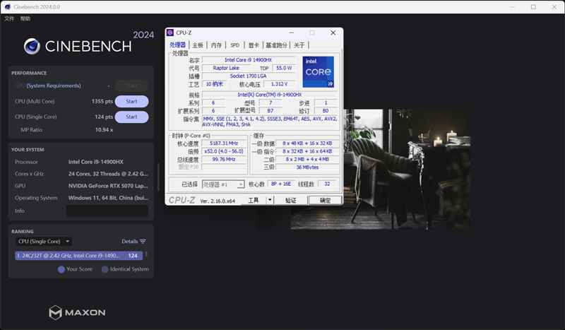 在CINEBENCH R2024测试中,单线程成绩为124,多线程成绩为1355。