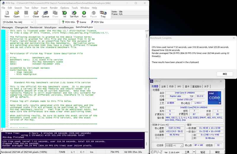 在POV-Ray测试中,单核成绩为794.29PPS,多核成绩为9458.56PPS。