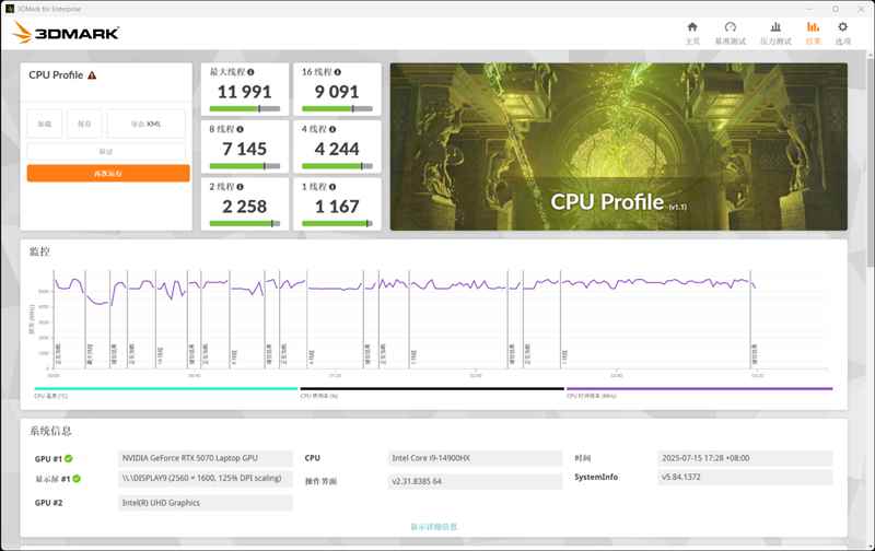 在3Dmark CPU性能测试中,单线程成绩为1167,最大线程成绩为11991。