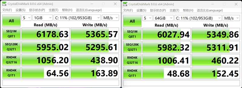 在CrystalDiskMark测试中,实测持续读写速度分别为6178MB/s和5365MB/s,4K随机读写速度为64 MB/s和163 MB/s,表现不错。