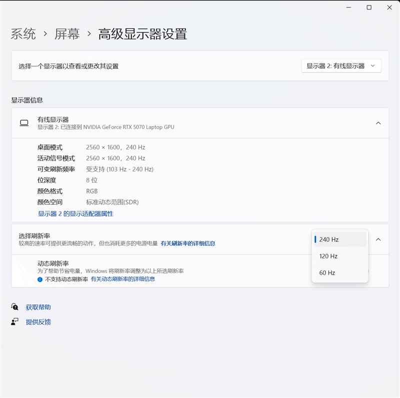 暗影精灵11笔记本的屏幕可以在设置中直接选择240Hz刷新率。
