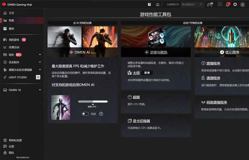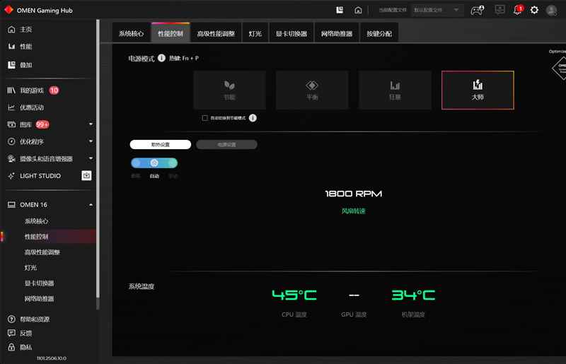 烤机测试之前,我们在惠普的OMEN Gaming Hub软件中,将性能控制设置为大师模式,并保持默认状态,没有额外进行手动超频。