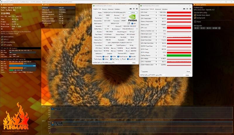 GPU单烤十分钟,OMEN暗影精灵11笔记本搭载的NVIDIA RTX 5070笔记本电脑GPU可以稳定释放约115W功率,核心频率约1.9GHz,温度约63.3度。